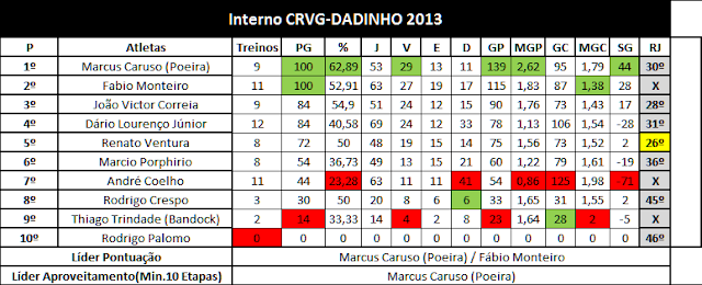 Vale lembrar que todo treino vale para a contagem de pontos do Campeonato Interno da modalidade. Confira então como esta a classificação atualizada da disputa: