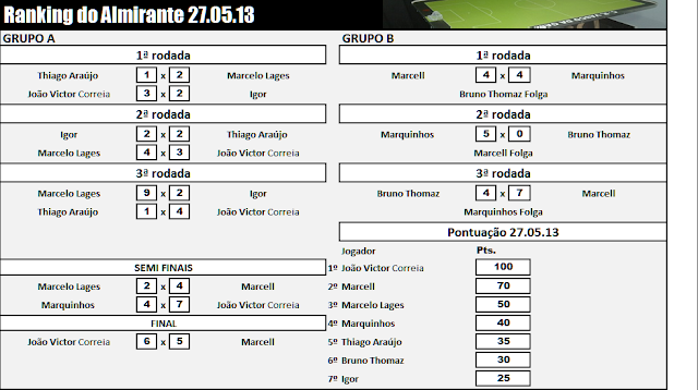 Foi realizado na noite da última segunda-feira (27/05) na Divisão de Futebol de Mesa do C.R. Vasco da Gama a disputa do último torneio correspondente ao mês de Maio do Ranking do Almirante 2013 da modalidade Bola 12 Toques.