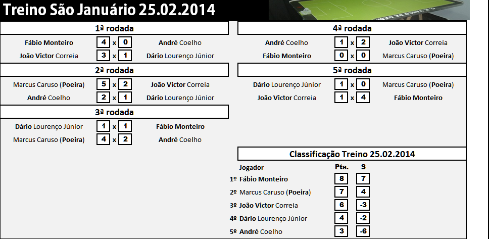 Foi realizado na noite desta terça-feira (25/02) na Divisão de Futebol de Mesa do C.R. Vasco da Gama o 3º treino válido para o Interno 2014 da Modalidade Dadinho 9×3 Toques.Este treino foi marcado pela visita do ex-integrante da equipe Dário Lourenço Júnior(hoje atleta da modalidade Bola 12 Toques). Confira os resultados !