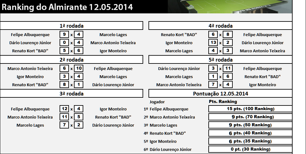 Foi realizado na noite desta segunda-feira (12/05) na Divisão de Futebol de Mesa do C.R. Vasco da Gama o treino de número 13 válido para o Interno 2014 da Modalidade Bola 12 Toques.Confira os resultados !