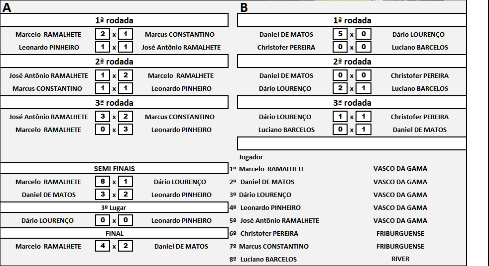 Marcelo Lages que chegou ao evento como campeão estadual confirmou o favoritismo e derrotou Daniel Matos(um dos maiores entusiastas da modalidade) na final por 4 x2.