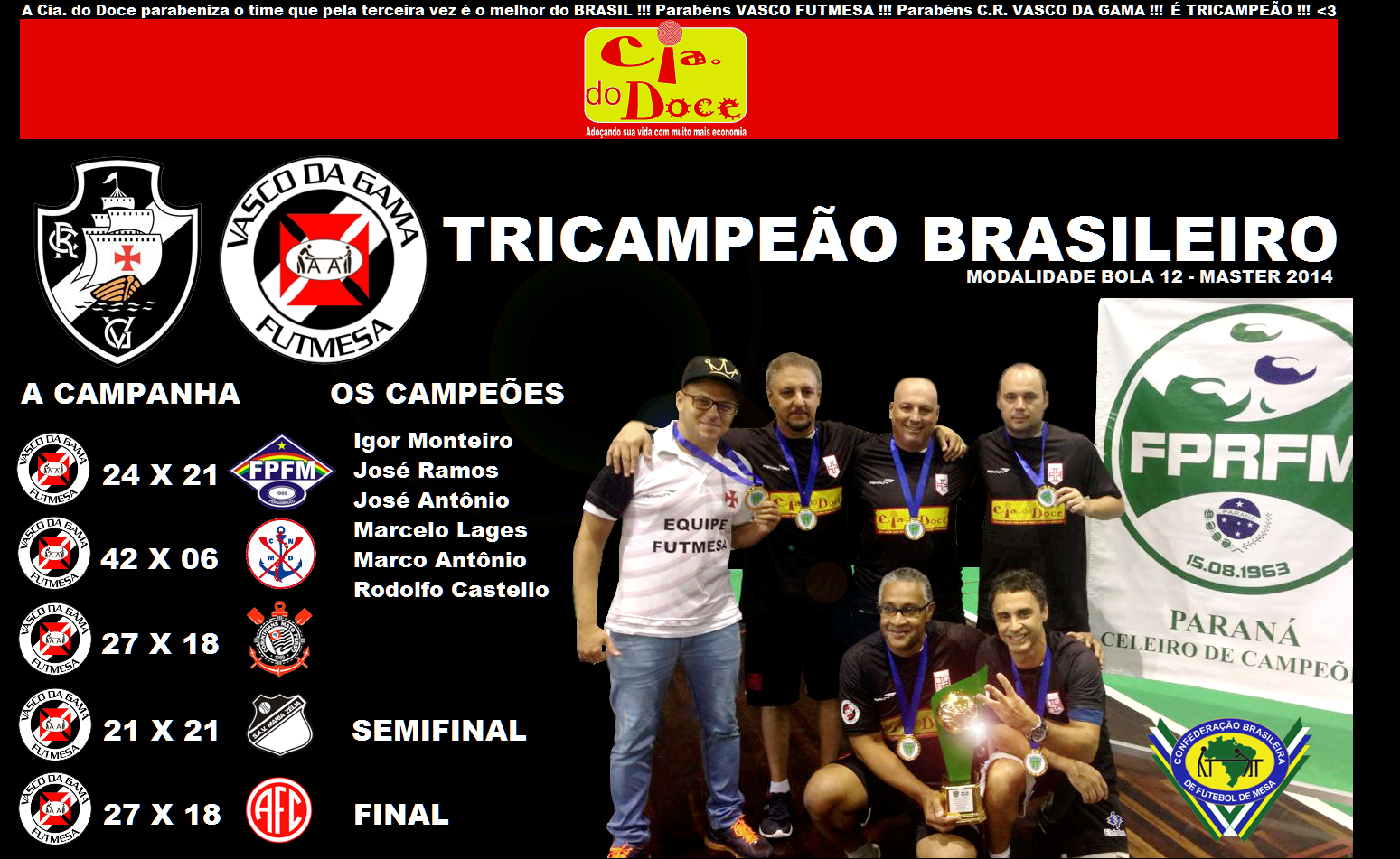 Em 2014 no Paraná, a equipe vascaína chegou ao Tricampeonato ao derrotar o America-RJ na final pelo placar de 27 x 18. A equipe foi formada por Marcelo Lages, Marco Antônio, José Antônio, Ramos e Rodolfo, comandada pelo Técnico Igor Monteiro.