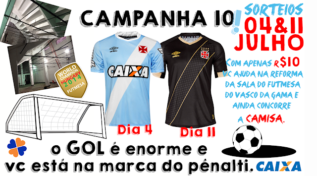 A Divisão de Futebol de Mesa do CR Vasco da Gama promove a Campanha 10! onde serão sorteadas pela Loteria Federal 2 (duas) camisas oficiais do CR Vasco da Gama para ajudar na reforma da nova sala do departamento em São Januário. Além de já contar com o apoio da Cia. do Doce o departamento promove esta ação devido a dimensão da obra e pede a ajuda de todos !!! Serão dois sorteios distintos, o primeiro no dia 04/07 (camisa de goleiro) e o segundo no dia 11/07 (camisa nº 3). Para concorrer a cada sorteio, vc só precisa contribuir com R$ 10,00 (Dez Reais) e indicar qual sorteio pretende concorrer. Será permitida a compra de mais de uma numeração para cada sorteio ou a compra para as duas datas.