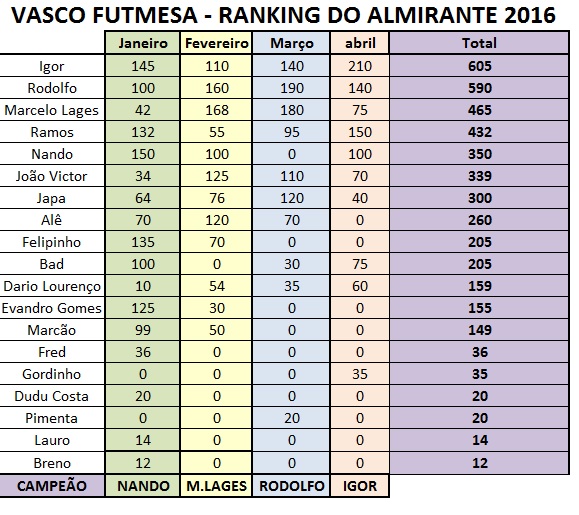 Finalizado o mês de abril, Igor Quintaes lidera o Ranking do Almirante da regra 12 toques – competição interna da Divisão de Futebol de Mesa do Vasco da Gama. É disputado todas as segundas-feiras e conta pontos para o ranking do mês. No final do ano, o somatório dos meses é realizado com dois meses de descarte para conhecer o campeão do Ranking do Almirante do ano.