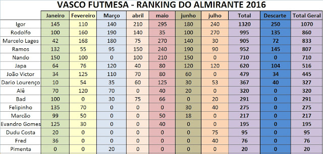 Observação: O Ranking do Almirante é disputado todas as segundas-feiras e conta pontos para o ranking do mês. No final do ano, o somatório dos meses é realizado com dois meses de descarte para conhecer o campeão do Ranking do Almirante do ano.